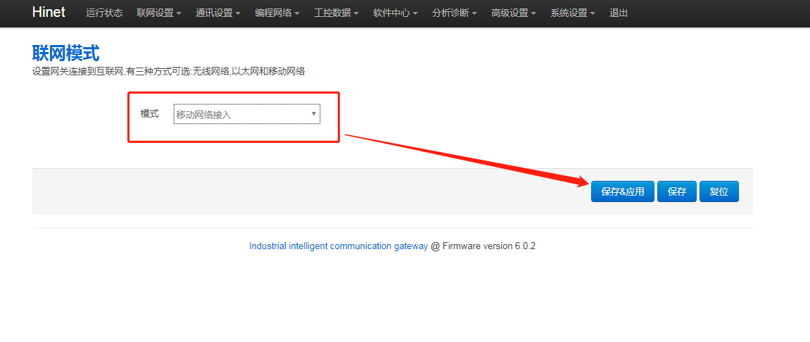 1. 网关后台联网模式是否正确,进网关后台,点击“联网设置 - 联网模式”,修改模式为“移动网络接入”,再点击【保存应用】,重启网关生效。